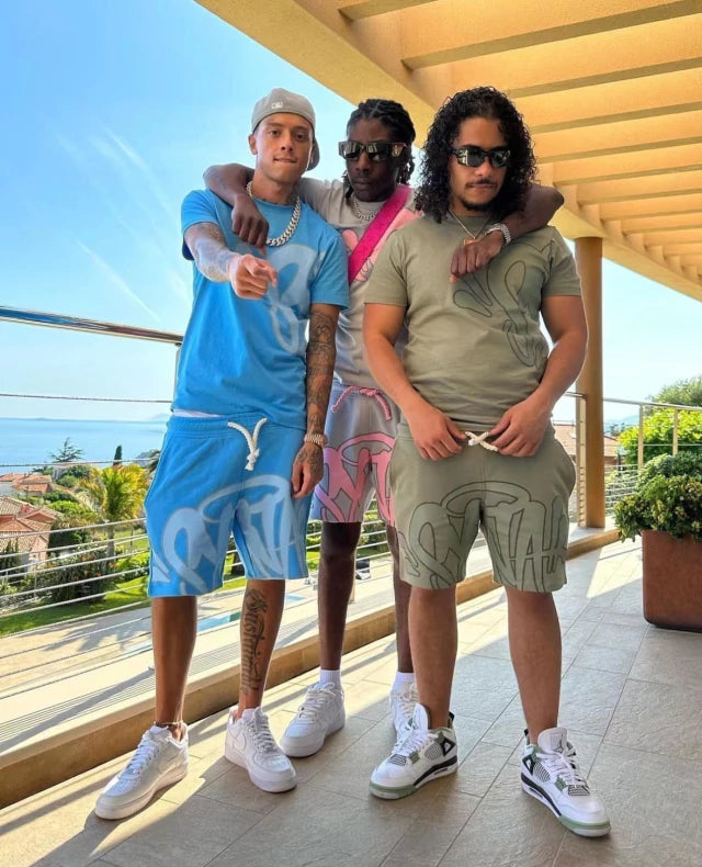 O tão aguardado Conjunto Syna do Central Cee com Camiseta e Bermuda, disponível em um tom Azul e com cordões Chunky,