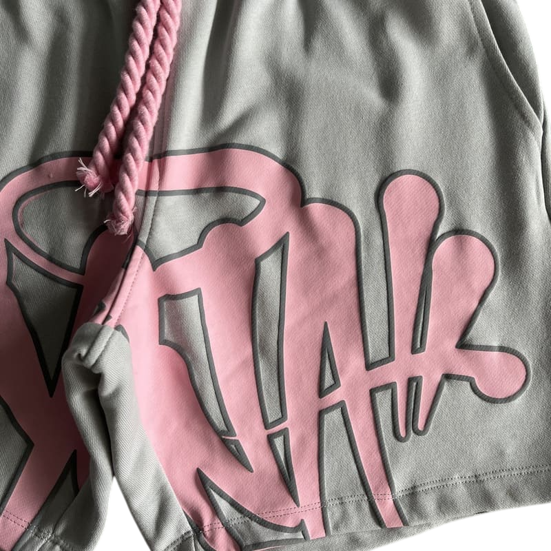 O tão aguardado Conjunto Syna do Central Cee com Camiseta e Bermuda, disponível em um tom Cinza com Rosa e com cordões Chunky,