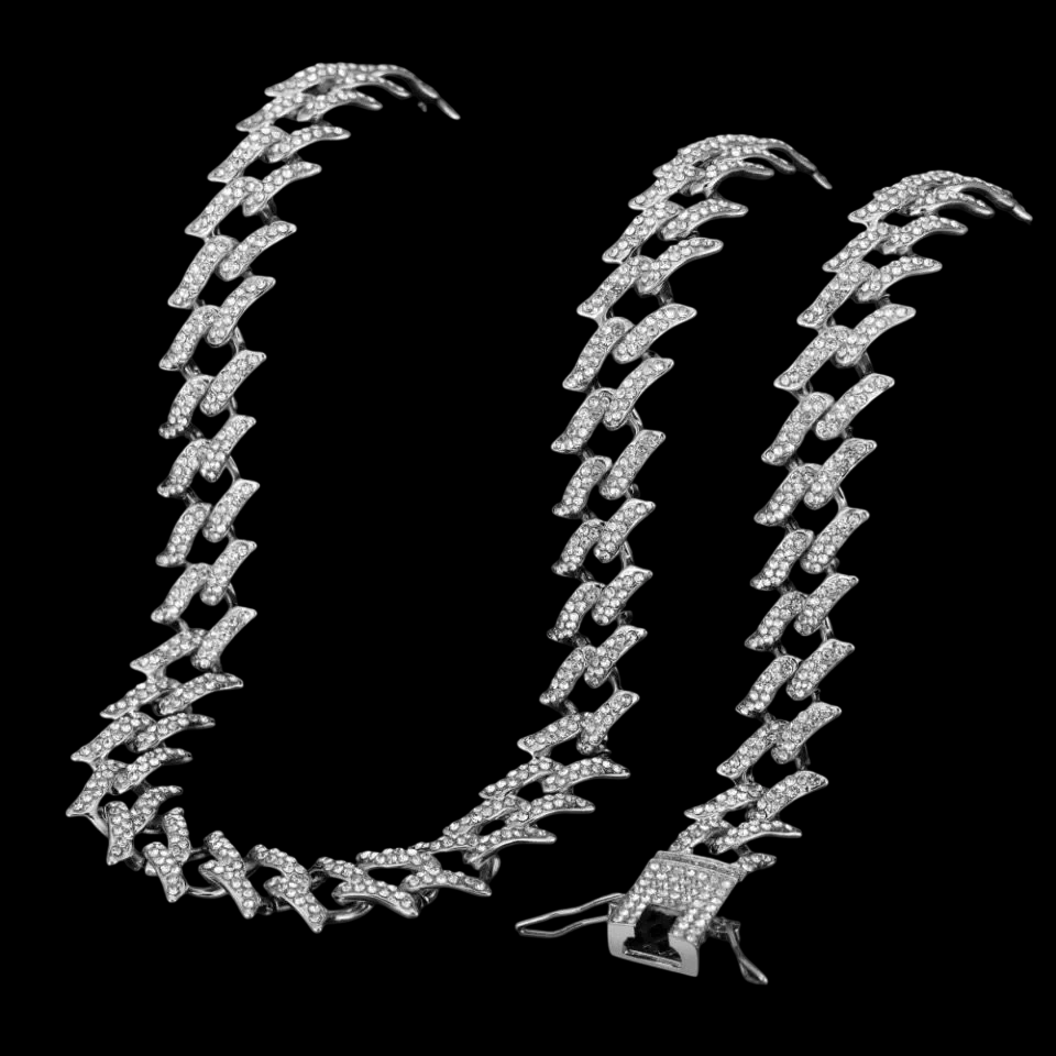Nossas correntes cravejadas são mais do que simples acessórios, são declarações de poder, elegância e individualidade, cada peça é meticulosamente adornada com pedras cintilantes que capturam a luz de todos os ângulos, criando um efeito hipnotizante que atrai olhares e admiração instantaneamente.