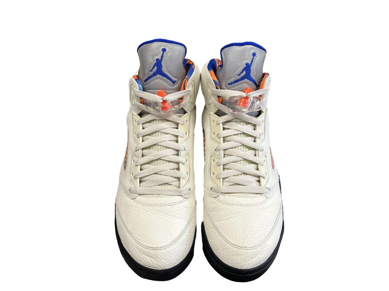 O Air Jordan 5 Retro “Orange Peel”, também conhecido como “The International Flight”, é uma homenagem ao impacto de Michael Jordan na popularidade do basquete em todo o mundo. O colorway foi inspirado especificamente nos uniformes azuis e laranja que Jordan usou em um jogo de exibição em Barcelona, em agosto de 1990, para uma turnê promocional da Nike Europa. O design apresenta uma parte superior em couro Sail acentuado por um padrão azul e laranja baseado na icônica arte de rua de Barcelona, visível no forro e através da malha do painel lateral. O sapato também inclui a língua reflexiva 3M exclusiva do Jordan 5, uma entressola preta com detalhes de dente de tubarão laranja e uma sola translúcida sob o pé.